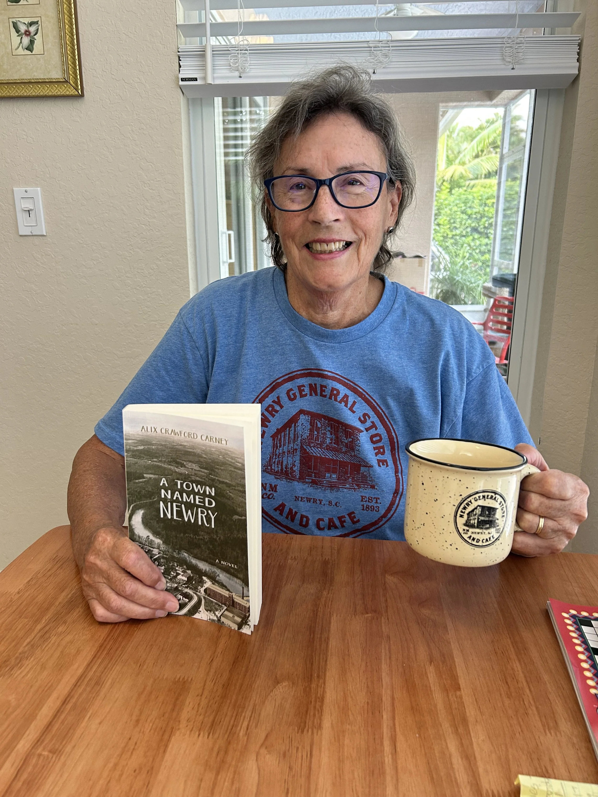 Author Alix Crawford Carney with her novel and a cup of Newry Cafe Latte