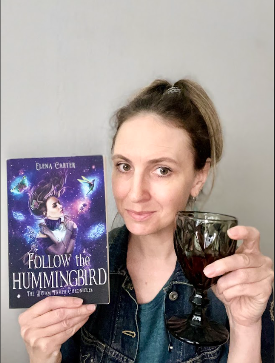 Author Elena Carter with her book Follow the Hummingbird paired with a homemade mint lemonade