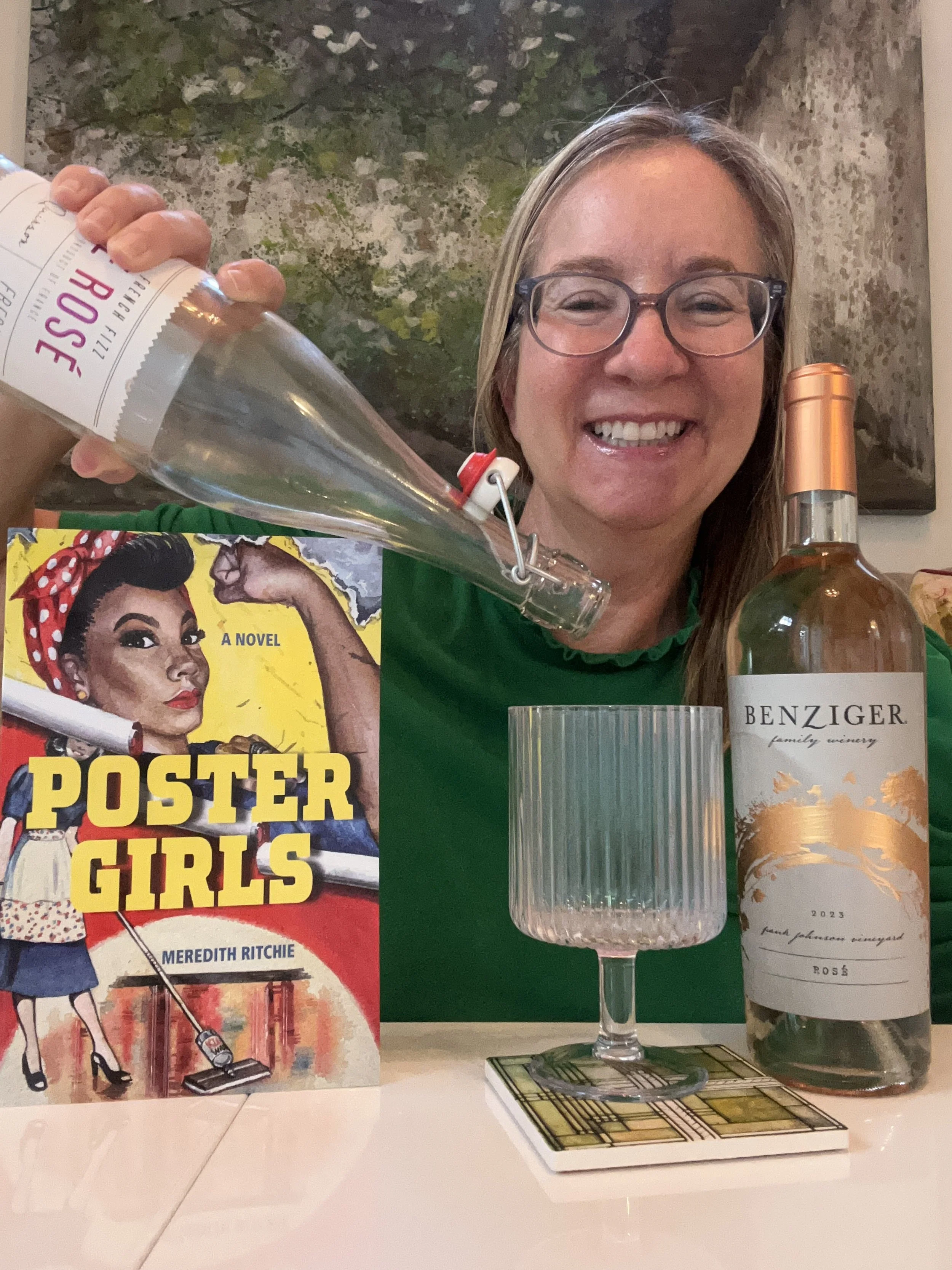 Author Meredith Ritchie with her novel Poster Girls and a bottle of Rose