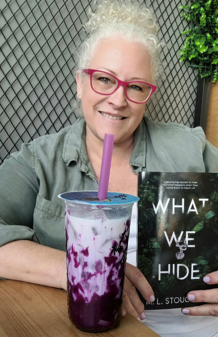 Author M.L. Stoughton with her novel What We Hide paired with a boba tea