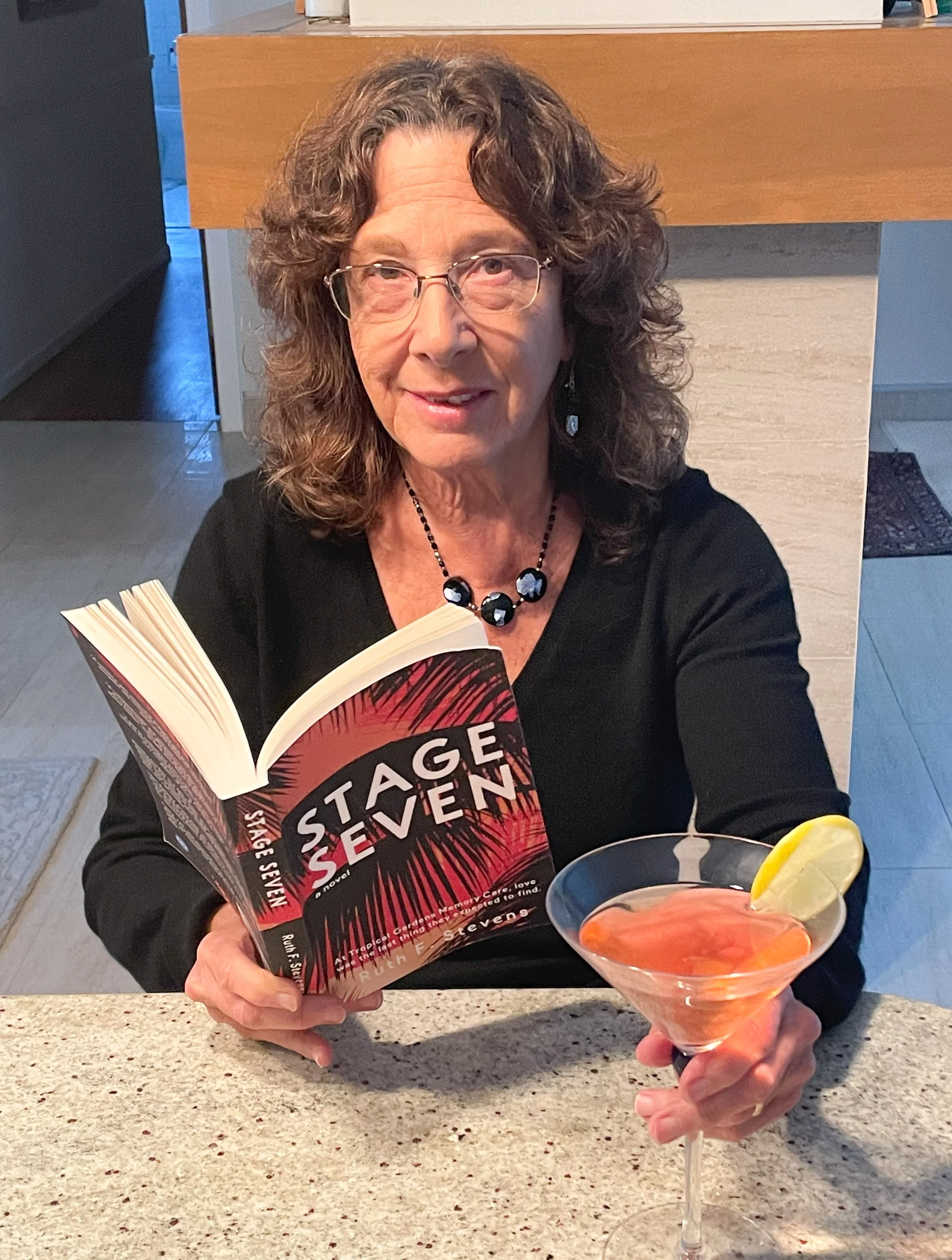 Author Ruth F. Stevens with her novel Stage Seven paired with a Cosmopolitan made with SKYY vodka