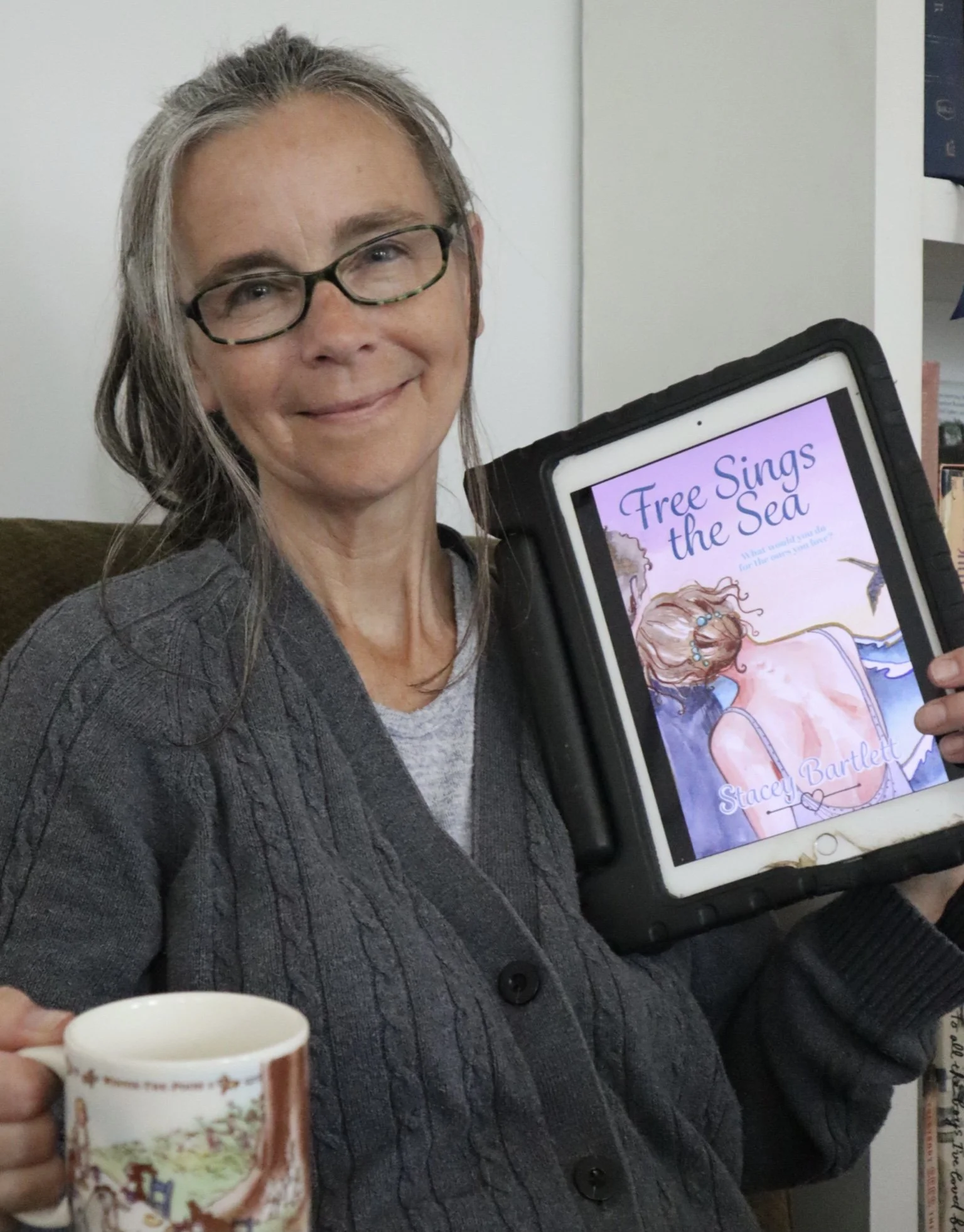 Author Stacey Bartlett with her novel Free Sings the Sea and a Celestial Seasonings Chamomile Tea